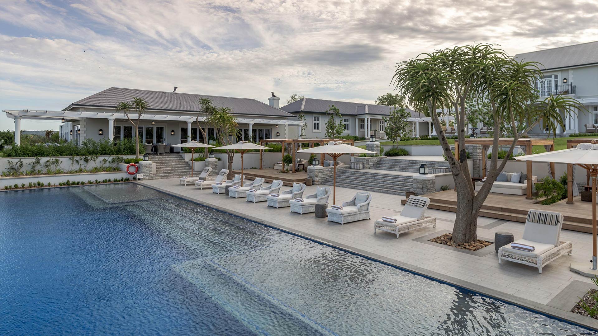 At Long Lee Manor you’ll find 18 beautifully appointed rooms and suites designed in an elegant Edwardian-inspired style. The configuration includes one family suite (two en-suite bedrooms, lounge and private heated plunge pool, sleeping up to four adults and two children aged 6–11) plus 11 Plains Rooms with private verandas and outdoor showers (two of which interlead and one of those is wheelchair friendly), and 4 Garden Rooms with private verandas (interleading).